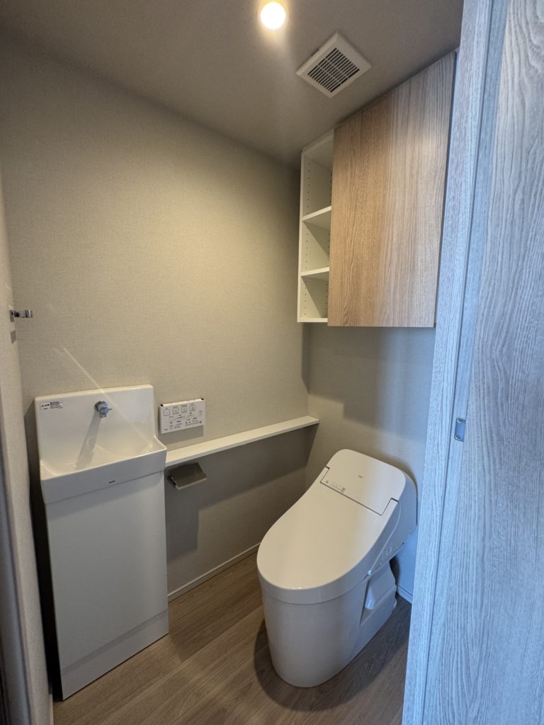 スタイリッシュなタンクレストイレを採用し、手洗い場と上部の収納も付いております。
