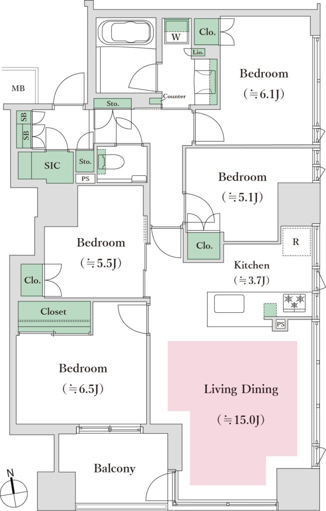 洋室4部屋(6.5畳/6.1畳/5.5畳/5.1畳)すべてにクローゼット付き。