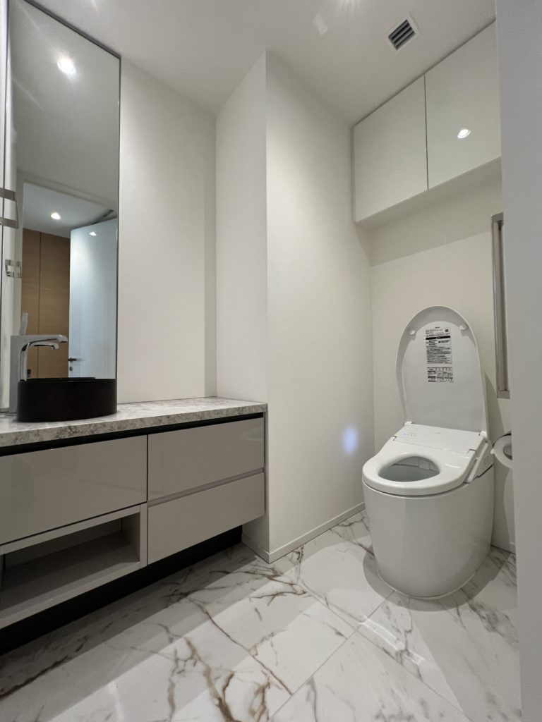 スタイリッシュなタンクレストイレを採用し、手洗い場と上部の収納も付いております。