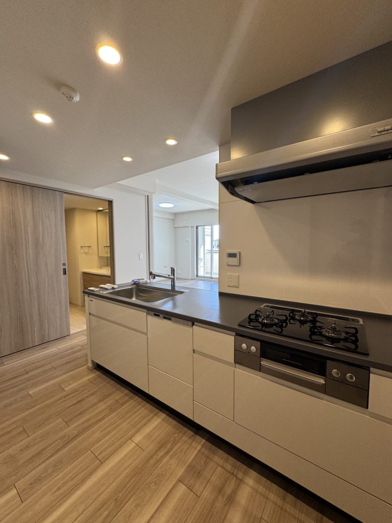 同時調理に便利な3口コンロで、収納スペースも十分確保されております。