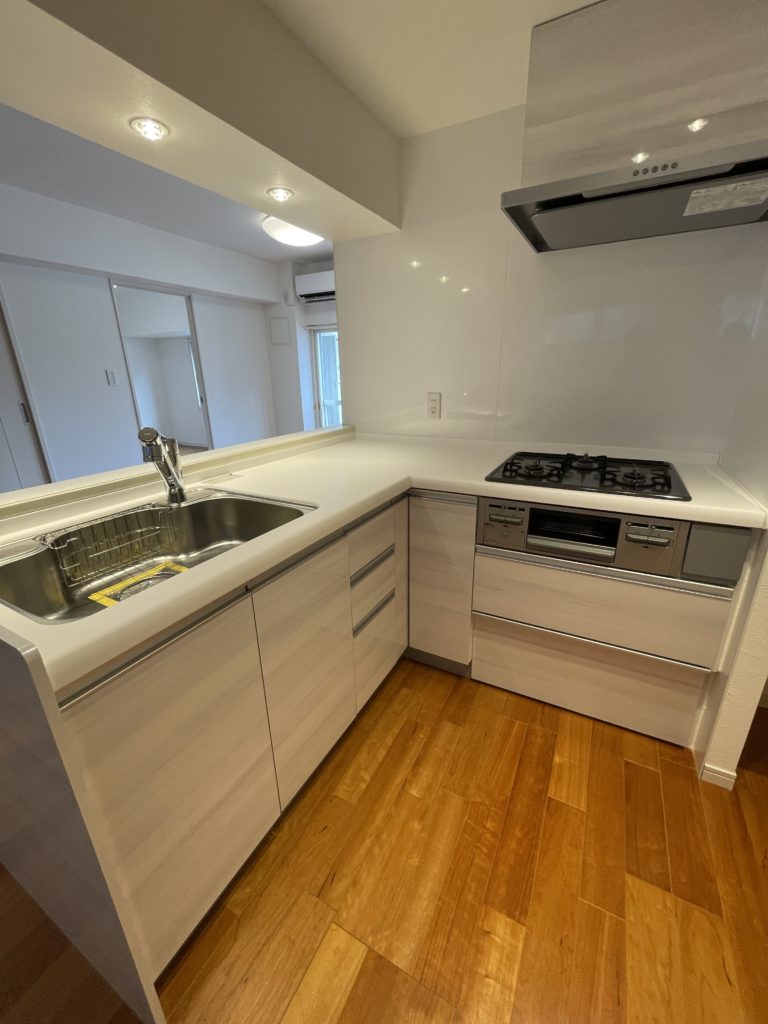 リフォームされたキッチンは白を基調とした清潔感のあるL型タイプ。作業スペースも広く料理の幅も広がります。