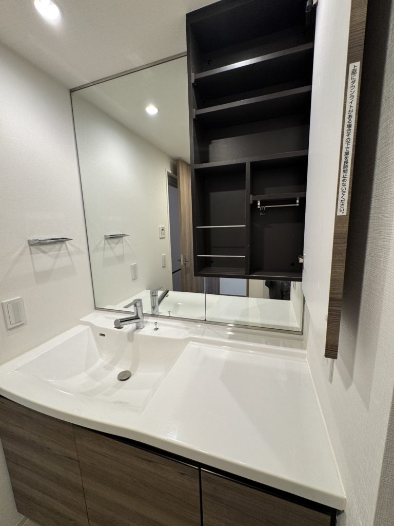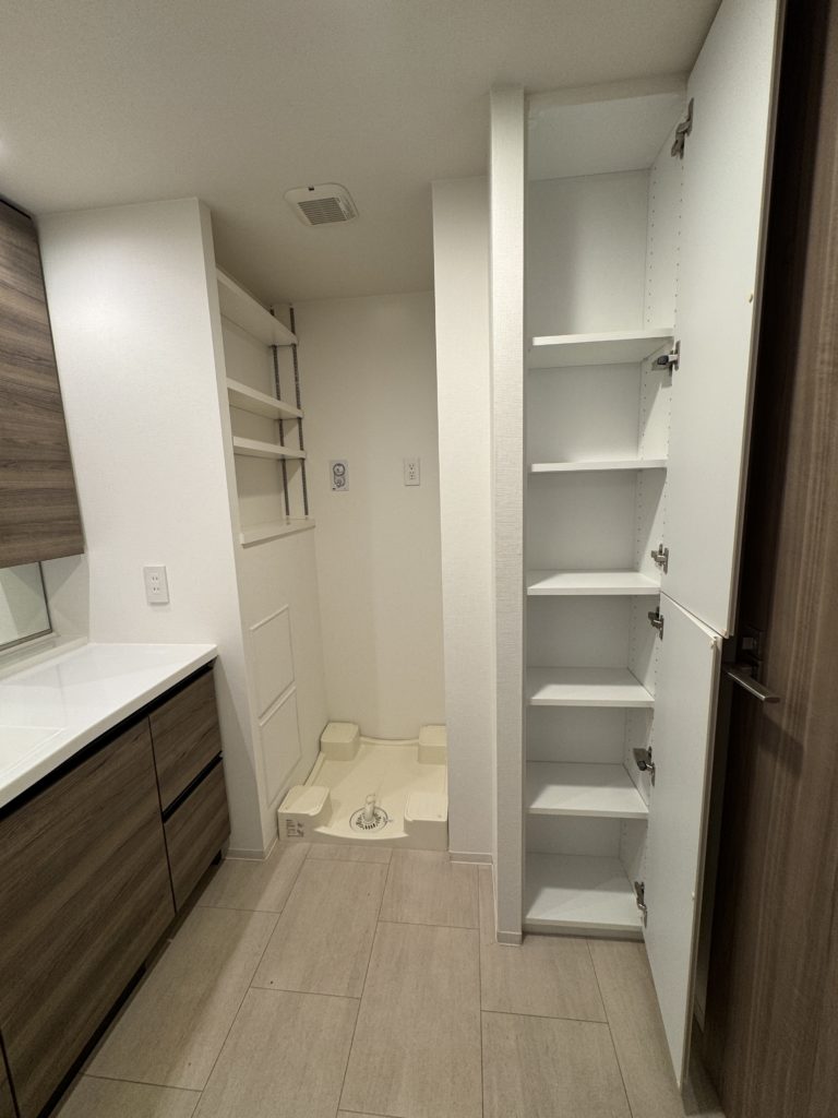 洗面脱衣所にも大きな収納棚がございますので、バスタオルやお着替えなど生活の導線に沿って収納可能です。