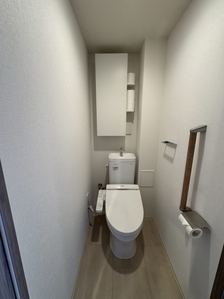 スタイリッシュなタンクレストイレを採用し、手洗い場と上部の収納も付いております。