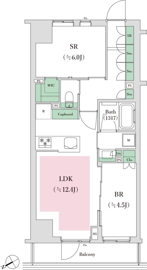 間取り:1SLDK(LDK12.4畳 洋室4.5畳/サービスルーム6畳)