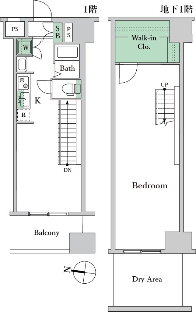 お部屋は1階と地下1階のメゾネットタイプです。1階はキッチンや浴室などが配置されており地下1階は広々としたベッドルームとなっております。