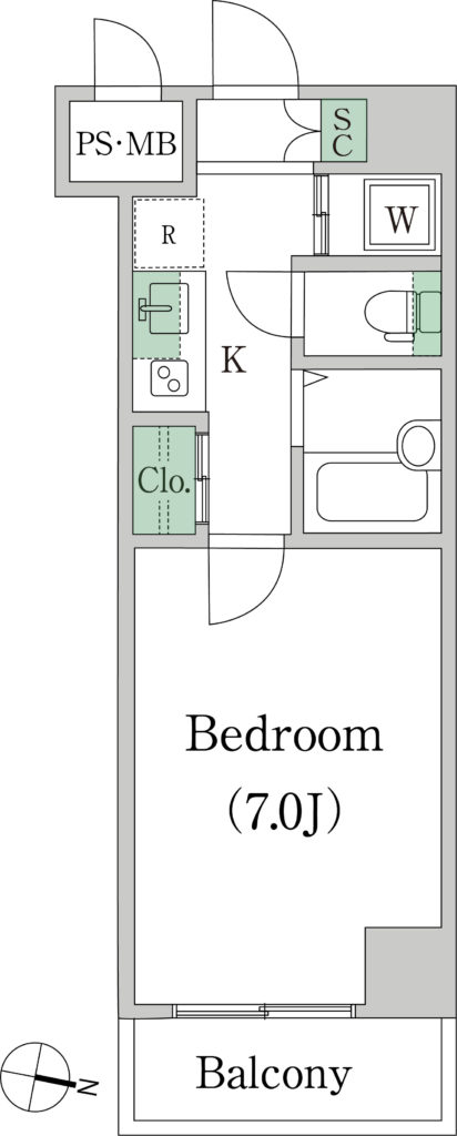ワンルームタイプながら、生活動線を考えた効率的なレイアウトで、空間を最大限に活用できます。家具の配置がしやすく、自分のライフスタイルに合わせたレイアウトが可能です。