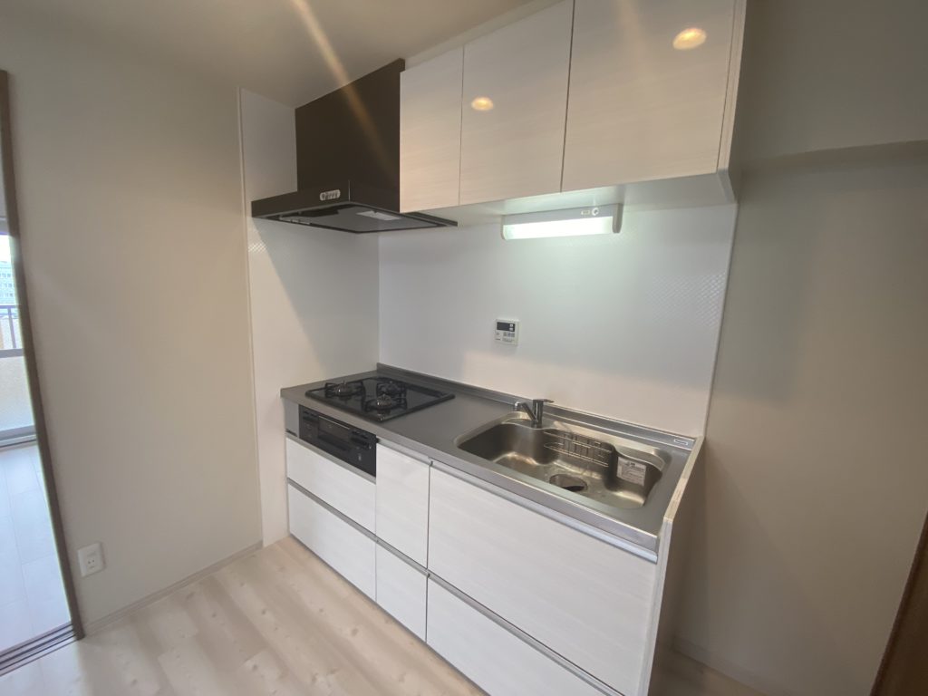 壁付けのキッチンは広めのシンクと3口コンロ。調理スペースも十分です。