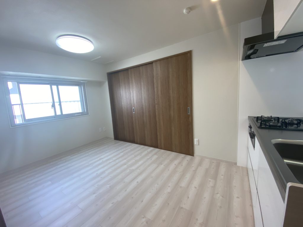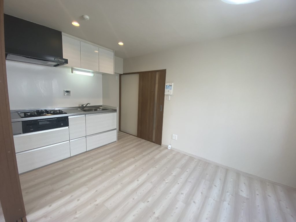 リノベーション済みの室内は空間を邪魔しないスライドドアを採用。DKスペースは窓からの日差しもあり明るい空間。